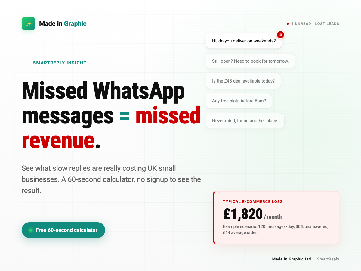 This guide breaks down the true cost of slow WhatsApp replies for UK small businesses, walks through three realistic scenarios (a cafe, a barber shop, and a small e-commerce store), and shows how to measure your own loss in under a minute with a free calculator built by Made in Graphic Ltd.